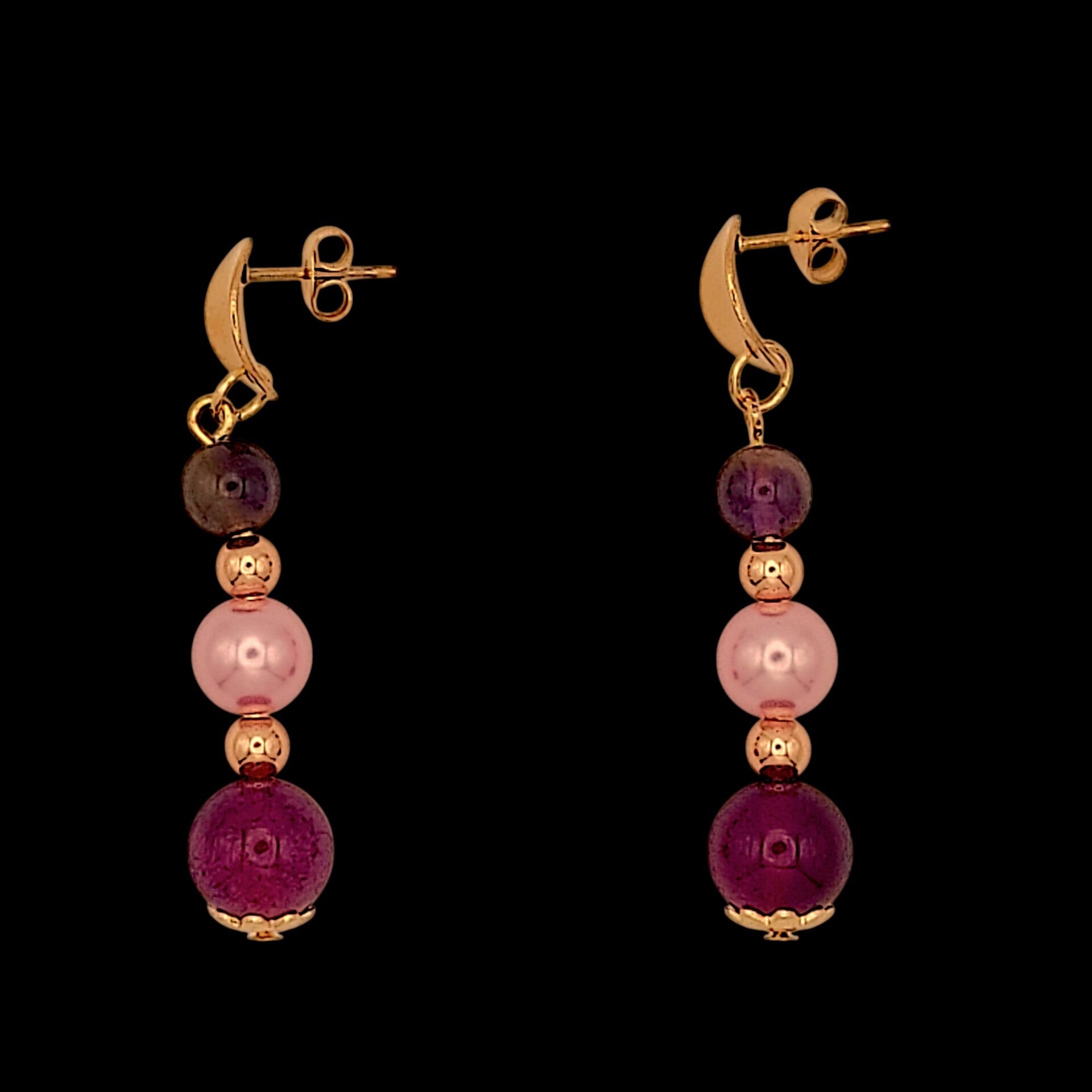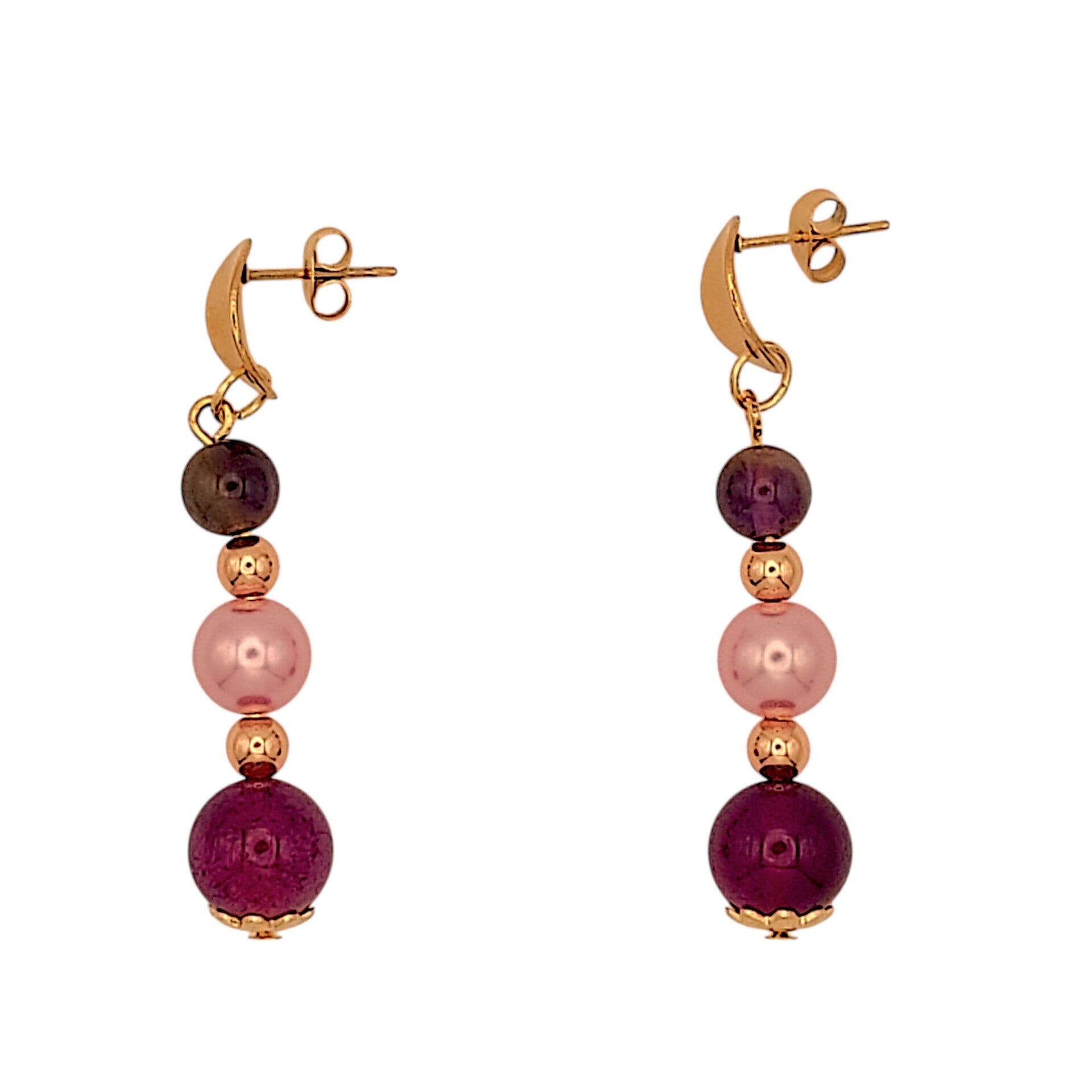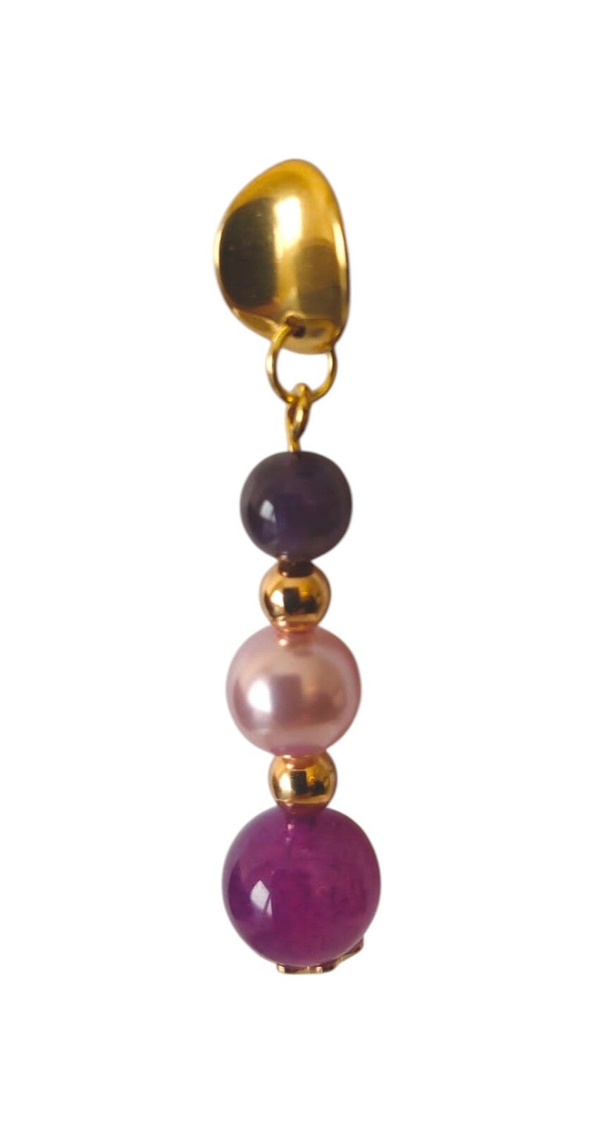 L’améthyste profonde apaise l’esprit, l’agathe apporte stabilité et harmonie, tandis que la perle d’eau douce naturelle diffuse une douceur nacrée, symbole de féminité et de pureté. L’hématite, aux reflets métalliques, ancre l’ensemble et sublime l’éclat du plaqué or 18k.