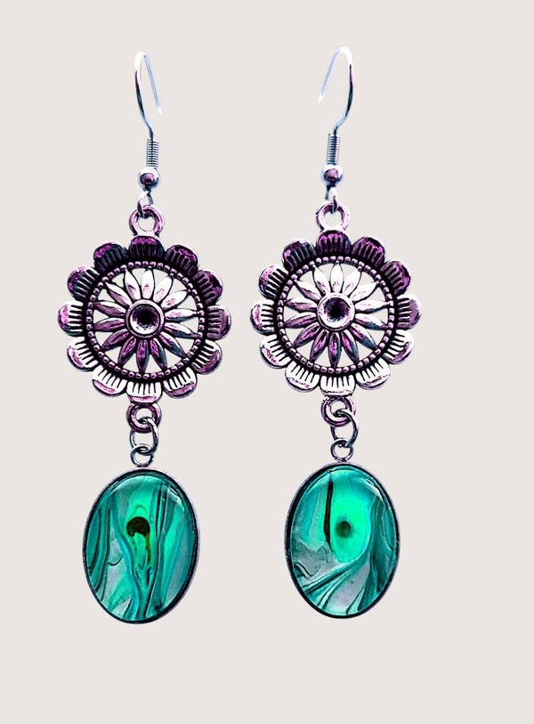 Avec sa fleur finement ciselée et son cabochon peint à la main, cette paire est une création artisanale aux couleurs bleu-vert apaisantes et harmonieuses.