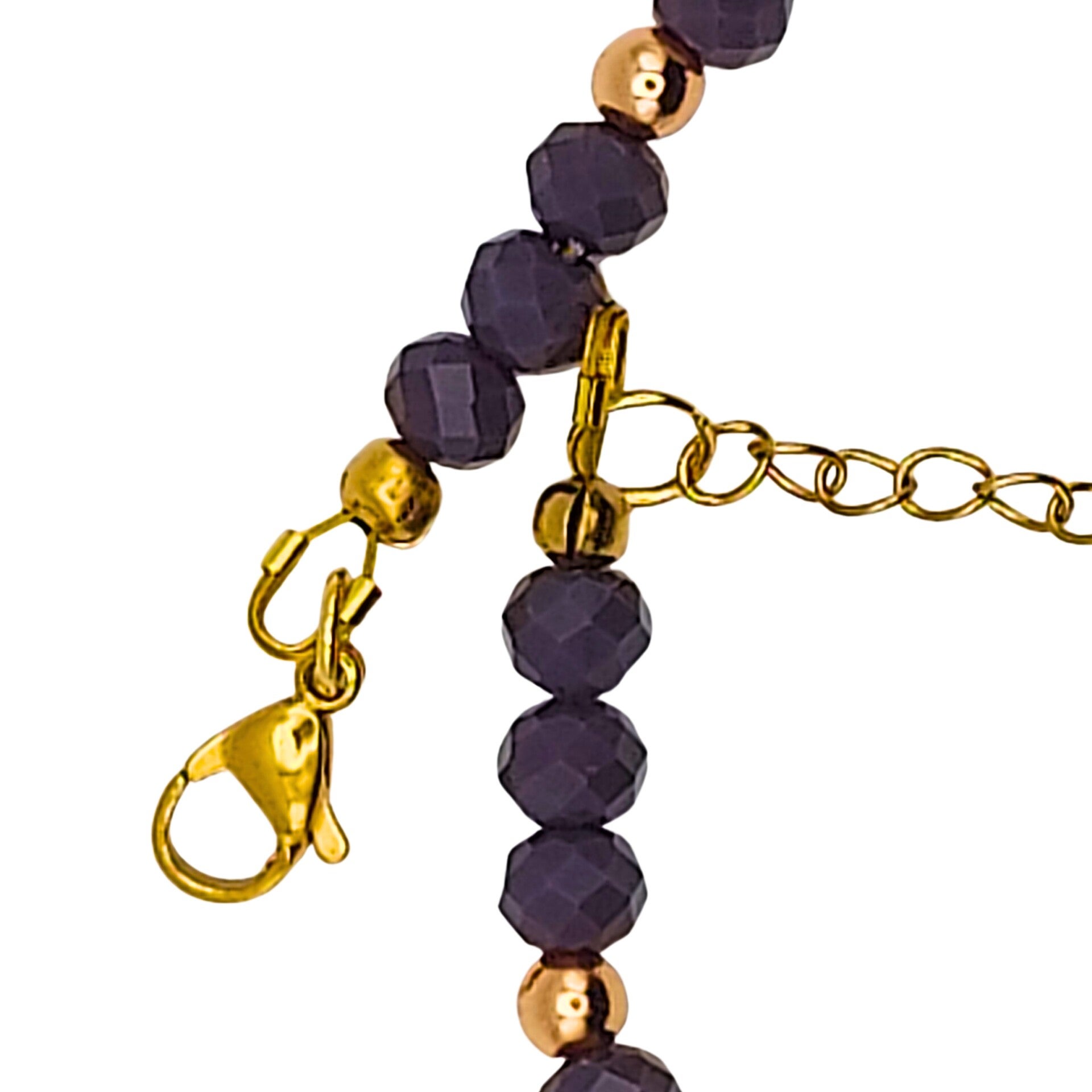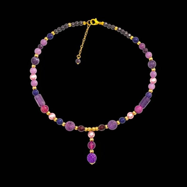 L’améthyste, pierre de sérénité et d’intuition, se mêle à l’agate, symbole d’ancrage et d’harmonie, pour créer un équilibre parfait entre force et douceur. Les perles d’eau douce naturelles ajoutent une touche de féminité intemporelle, tandis que les perles en verre facettées apportent éclat et modernité.