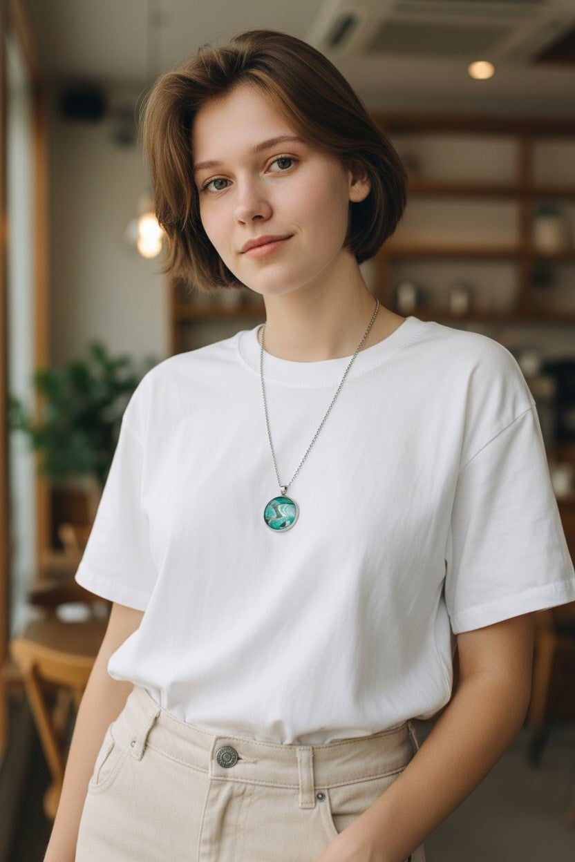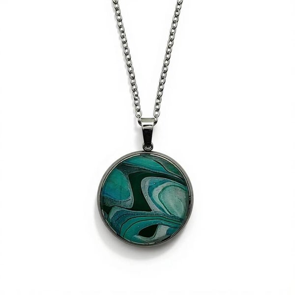 Laissez-vous hypnotiser par la magie du Collier Art "Aurore Boréale", un bijou qui capte le regard et éveille les émotions. Je me suis inspirée des danses célestes des lumières polaires, son cabochon en verre peint à la main révèle des nuances profondes de vert, de turquoise et de reflets nacrés, évoquant le mouvement, la fluidité et le mystère.