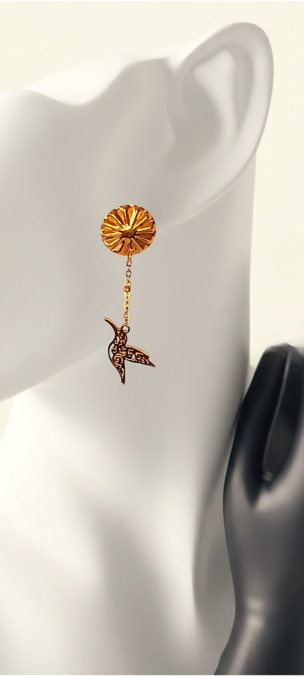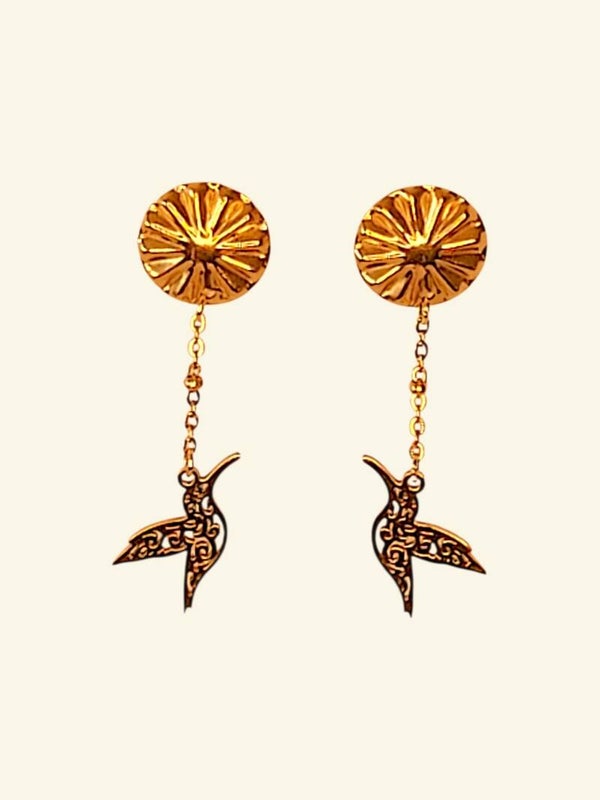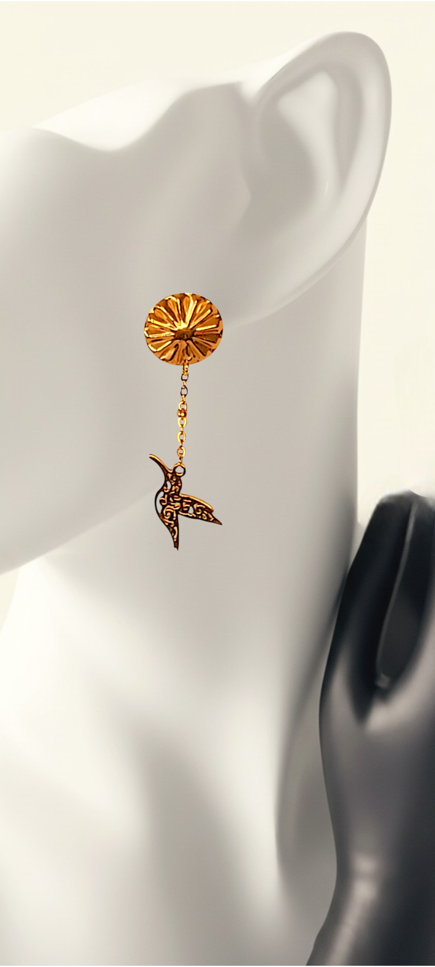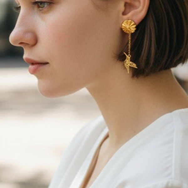 *J'ai composé ces boucles d'oreilles en recherchant un design raffiné, avec une forme arrondi rayuré doré à l'or fin 18 K, qui capte la lumière avec subtilité, prolongé par une fine chaînette doré à l'or fin 18K délicate. Au bout, un pendentif colibri finement travaillé doré à l'or fin 18K apporte mouvement et originalité à ce bijou unique, pour un look total chic.*