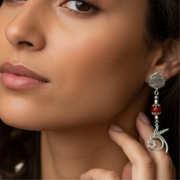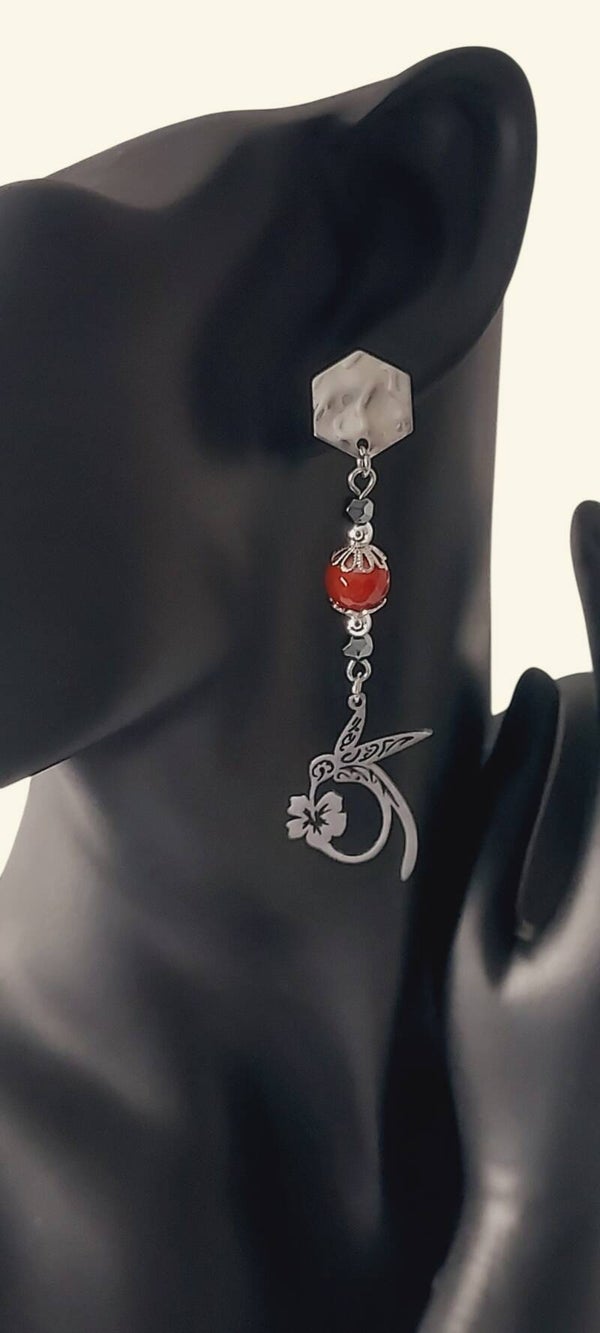 *J'ai composé ces boucles d'oreilles d’un colibri argenté en acier inoxydable, finement découpé et orné d’un motif floral. Au-dessus du pendentif, j'ai preféré une perle en agate au ton orangé profond ornée de capuchons argentés, fins et delicats, attirant le regard. J'ai sublimé l'ensemble par des hématites noires et hématites argentées, qui apportent un contraste uni et élégant, avec une touche contemporaine.