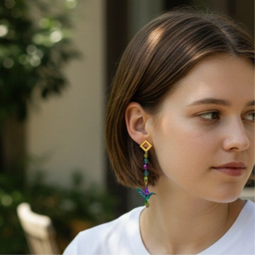 *Pour cette paire de boucles d'oreilles, j'ai selectionné un colibri irisé en acier inoxydable , qui révèle des reflets multicolores fascinants qui captent la lumière à chaque mouvement. Suspendu à une tige doré à l'or fin 18K, j'ai opté pour les perles facettées bleues en forme de goutte d’eau, d’une perle naturelle"œil de tigre" violette au caractère profond, et de cristaux autrichiens verts étincelants. Ce bijou est idéal pour sublimer un look quotidien ou compléter une tenue plus habillée.*