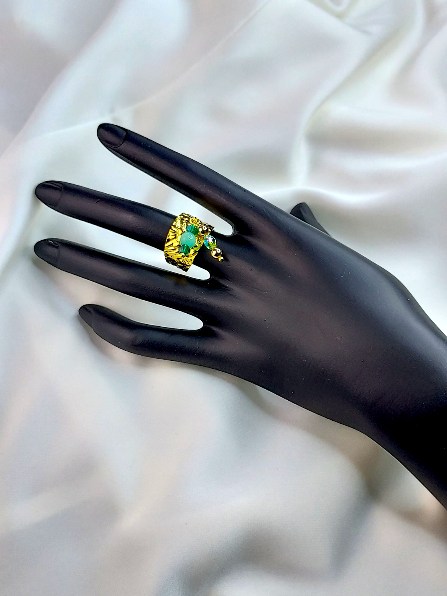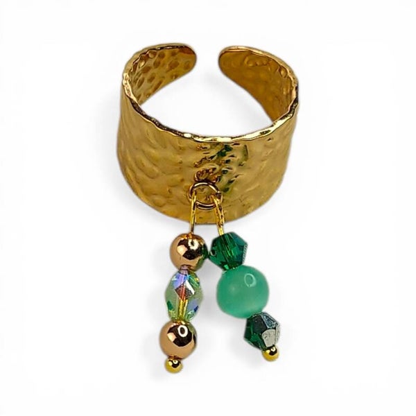 Laissez-vous séduire par cette bague en acier inoxydable dorée à l'or fin 18K, martelée, alliant finesse et caractère. Elle associe harmonieusement des perles en verre délicates, des perles en hématite dorée au reflet métallique, et une élégante perle œil de chat aux nuances lumineuses.