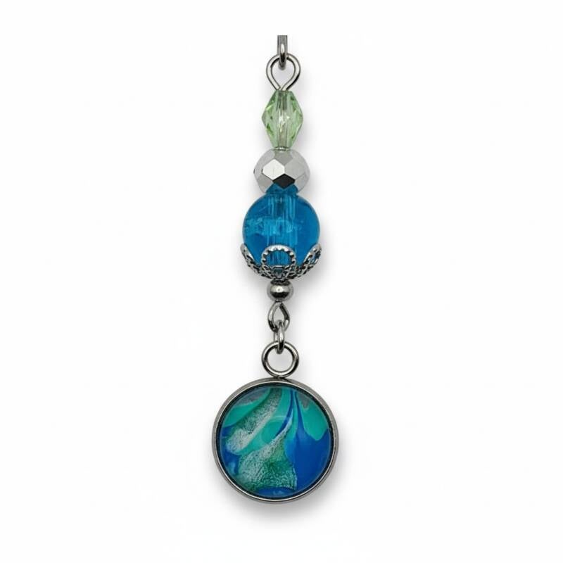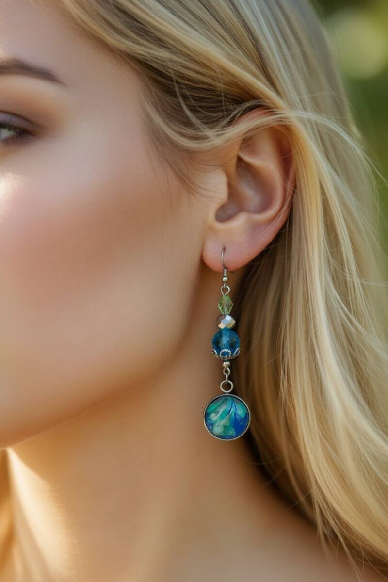 Avec son cristal de Bohème scintillant et son cabochon peint à la main. Cette paire est une création artisanale aux couleurs bleu-vert apaisantes et harmonieuses.